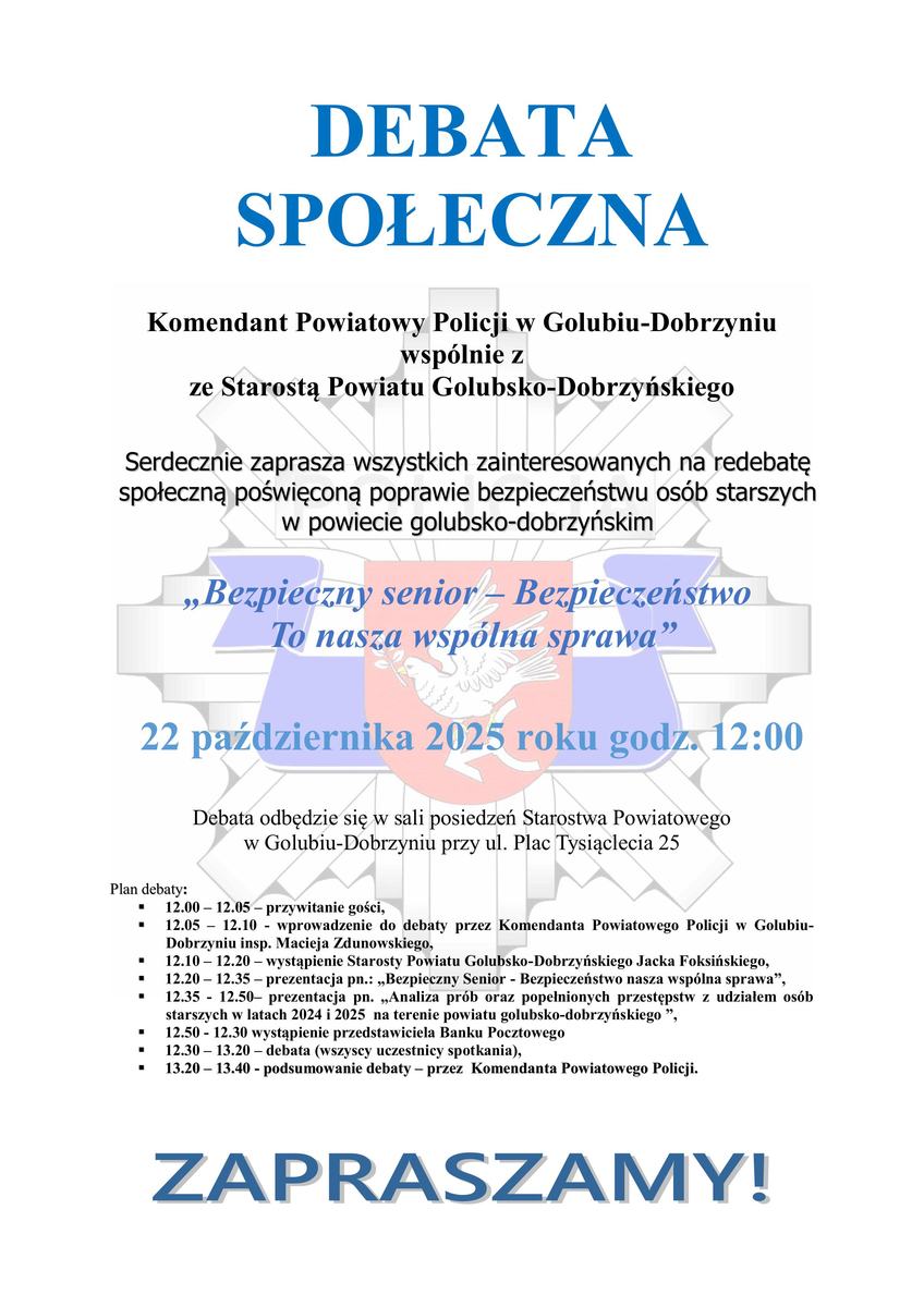 Komendant Powiatowy Policji w Golubiu-Dobrzyniu wspólnie ze Starostą Powiatu Golubsko-Dobrzyńskiego zapraszają mieszkańców powiatu na redebatę społeczną poświęconą bezpieczeństwu osób starszych pn. "Bezpieczny Senior - Bezpieczeństwo To nasza wspólna sprawa"