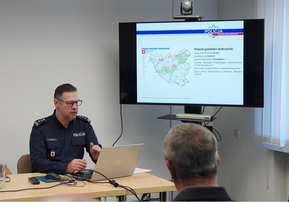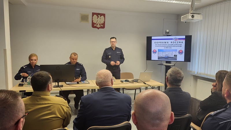 Komendant Powiatowy Policji w Golubiu-Dobrzyniu inspektor Maciej Zdunowski przedstawił i omówił prezentację multimedialną, która obrazowała wyniki pracy uzyskane w 2025 roku przez policjantów pionu kryminalnego, prewencji oraz ruchu drogowego a także strukturę funkcjonowania jednostki.